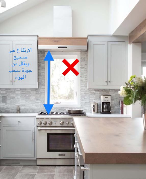 خطأ مُشاهد في بعض الفلل يتم التأسيس للفرن تحت النافذة وهذا يحرمك من تنفيذ مروحة فوق الفرن مباشرة + الهواء يدفع الروائح لداخل المنزل