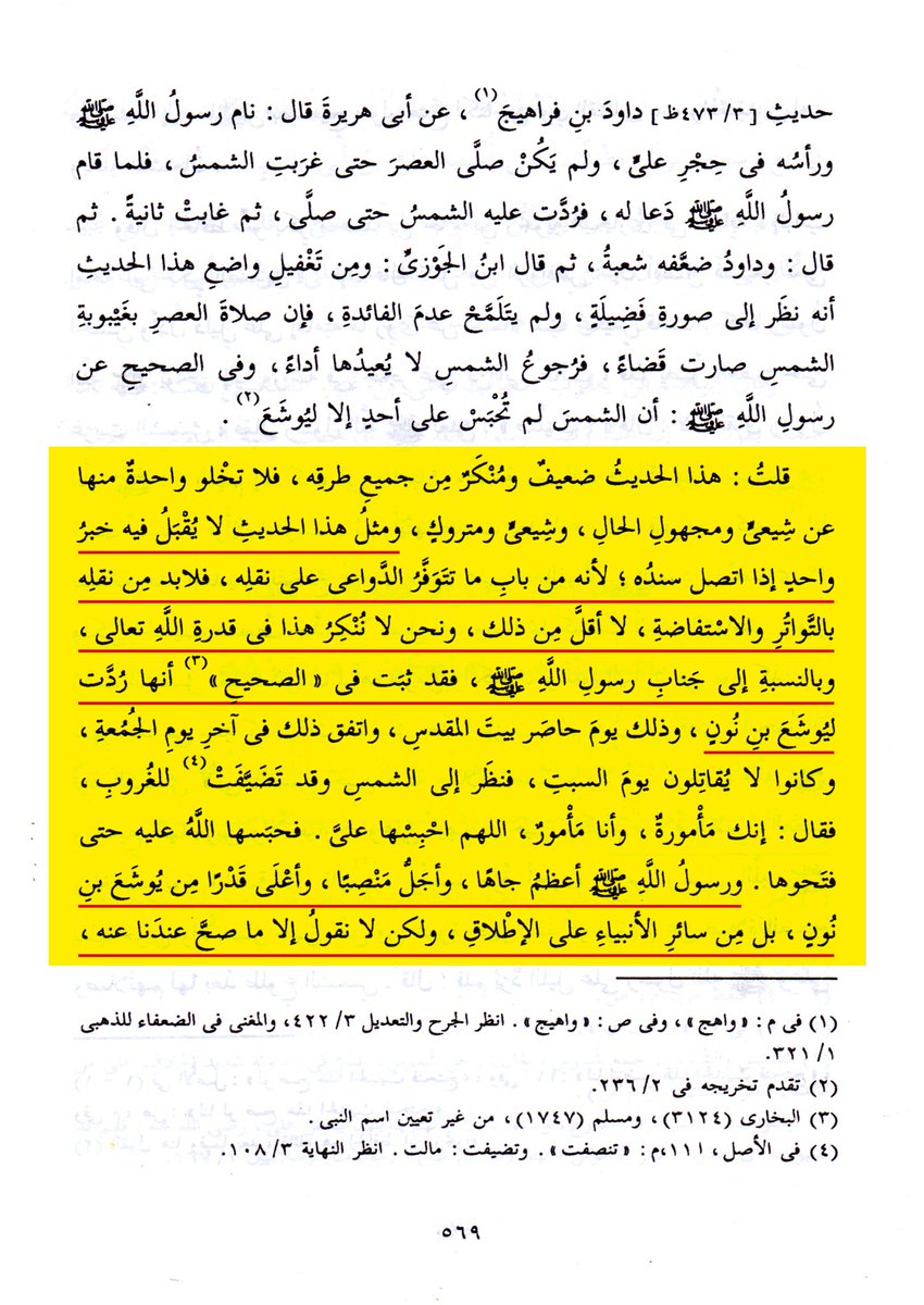 ١- قال ابن تيمية: (فإن قيل: فهذه الأمة أفضل من بني إسرائيل، فإذا كانت قد رُدت ليوشع، فما المانع أن تُرد لفضلاء هذه الأمة؟ فيقال: يوشع لم تُرد له الشمس، ولكن تأخّر غروبها: طُوِّل له النهار ... ونحن إنما علمنا وقوفها ليوشع بخبر النبي ...). 👇🏻