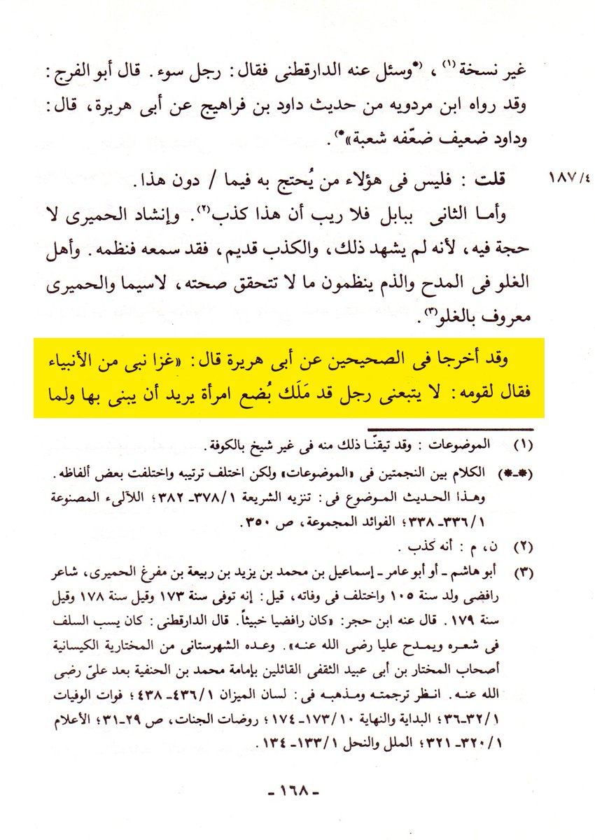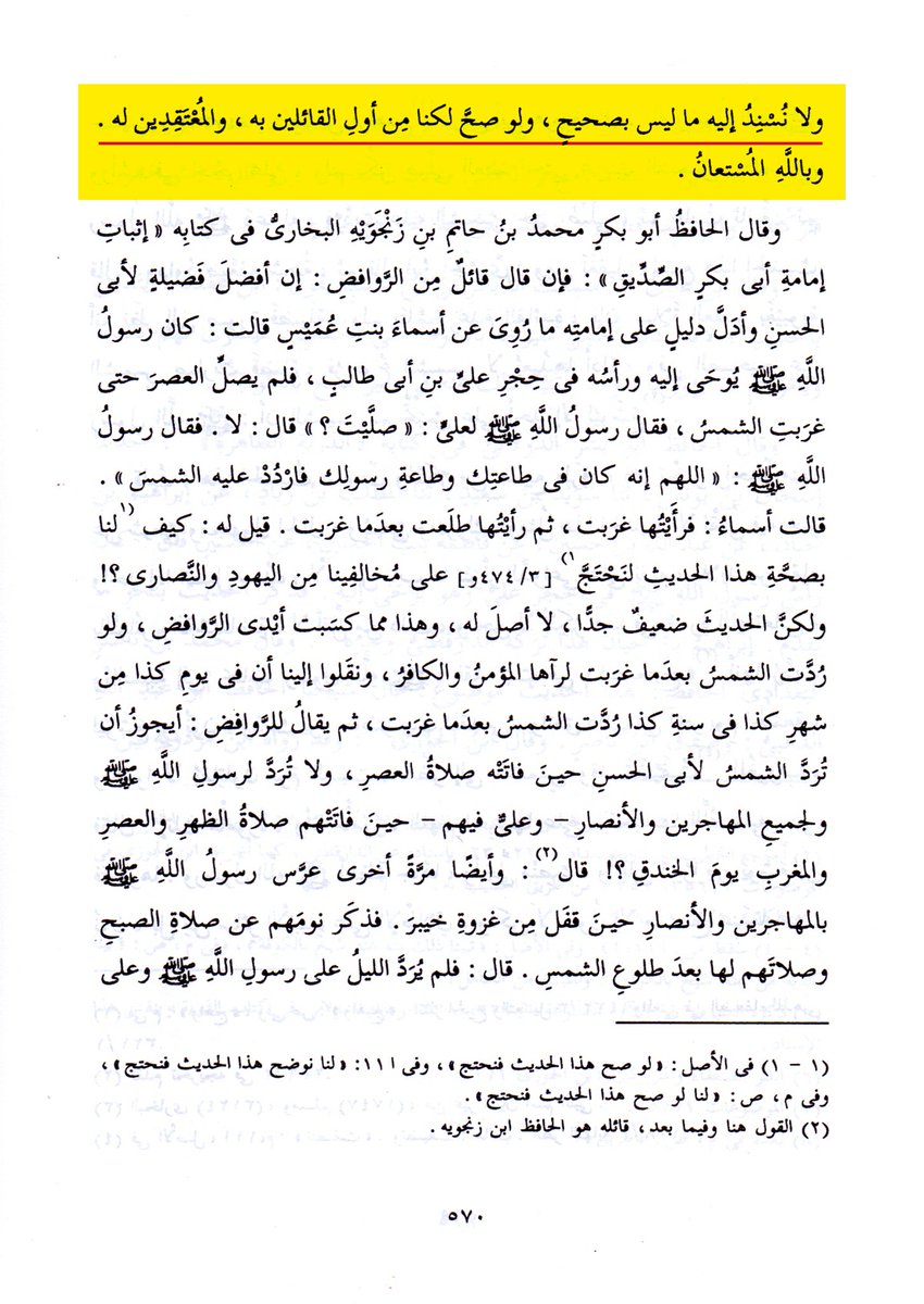 ٣- قال ابن الجوزي بعد تضعيفه لحديث رد الشمس: (وفي الصحيح عن النبي صلى الله عليه وسلم: "إنَّ الشمس لم تُحبَس على أَحَدٍ إلا ليوشع"). 👇🏻