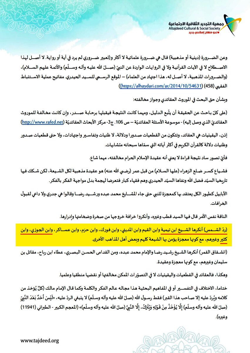 ثم تابعت الجمعية: "كما سمّوها خرافات وإسرائيليات وخيالات، وضعنا سابقاً أسماء تلك العلماء الأعلام مثل: الحسن البصري، الشيخ ابن تيمية، الإمام ابن القيم، الإمام ابن حزم، الإمام ابن الجوزي، الإمام ابن كثير، والشيخ المجدّد رشيد رضا"...الخ.