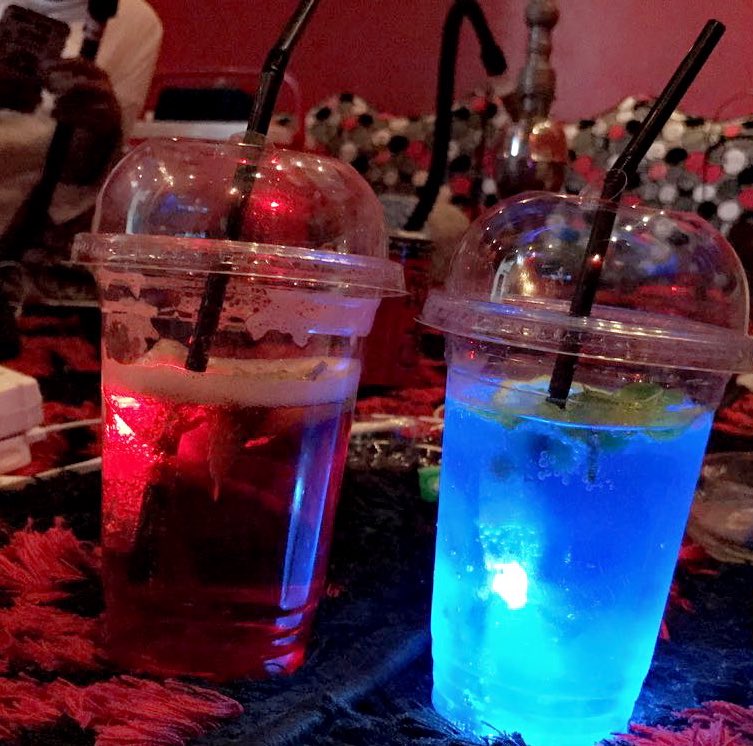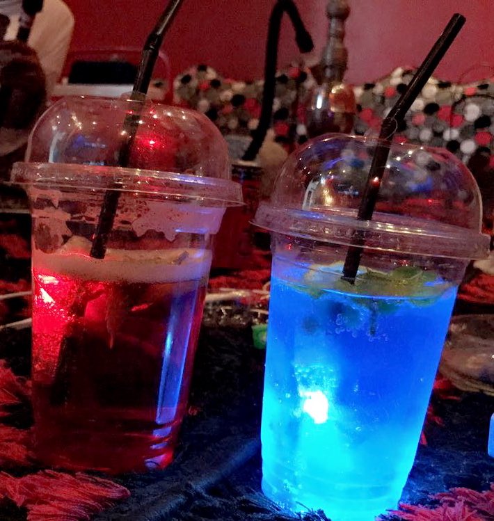 سويت نموذج اكواب بماء مع نكهه وحطيت اللمبات وكل كوب بلون مختلف وحطيتهم بالطاوله بالواجهه علشان اجذب كل من يخطم.