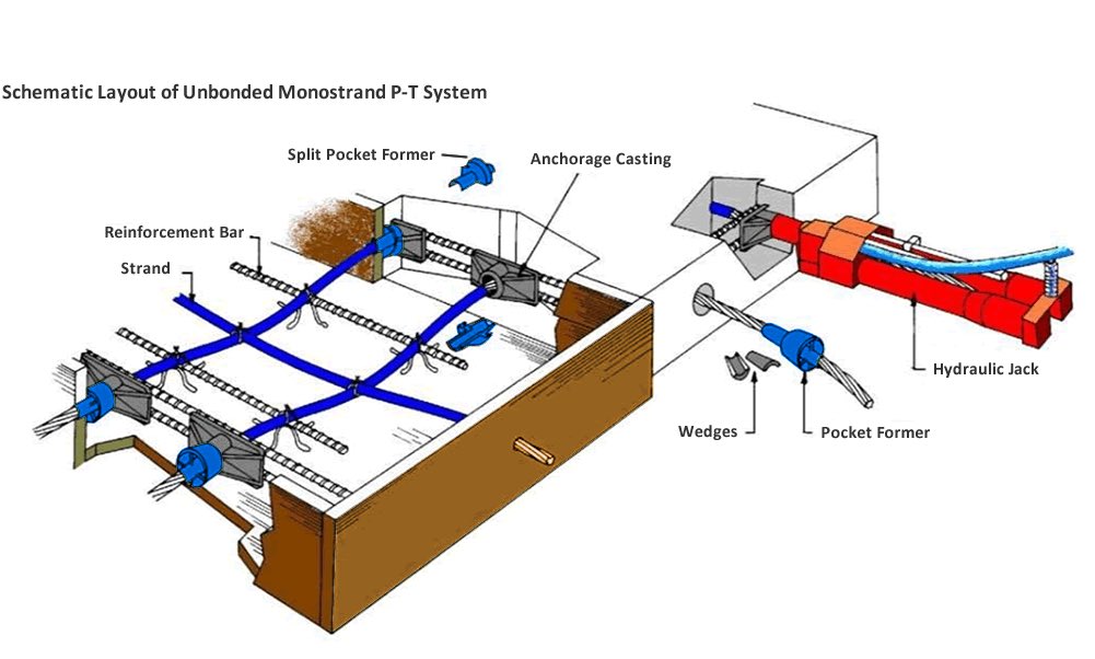 قبل عملية الشد يقوم عمال البوست تنشن بتنظيف أماكن الAnchor Head من بقايا الفليين و الخرسانه الزائده ووضع الويدجات وعمل علامة على الويرات عند نهاية الويدج قبل الشد بالمركر ومن بعدها تتم عملية الشد عن طريق Hydraulic Jack