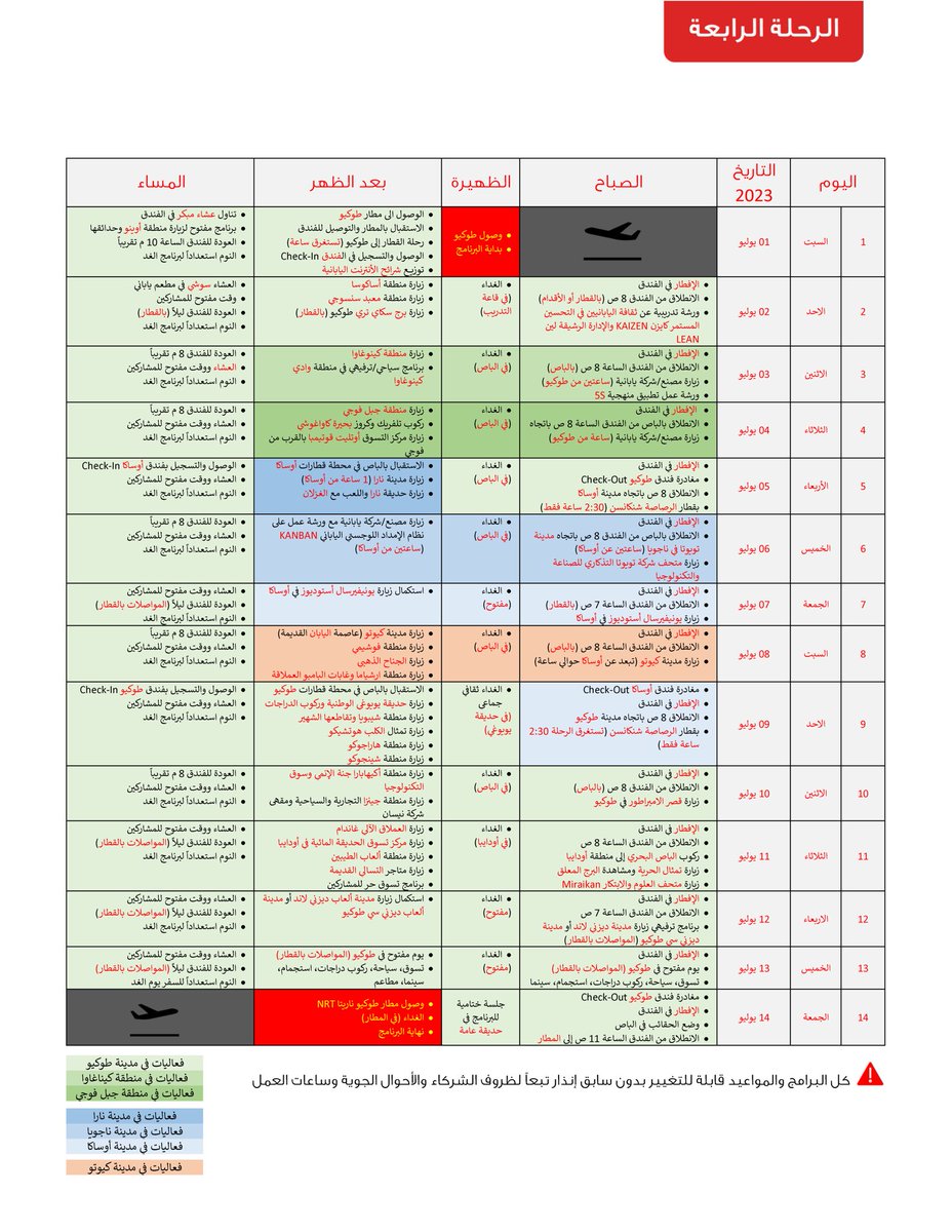 لغرض تعميق إلمام وفهم جميع المشاركين لثقافة اليابانيين ستبدأ الرحلة في يومها الثاني بورشة عمل تدريبية مدتها 5 ساعات لشرح ثقافة التحسين المستمر #كايزن و الإدارة الرشيقة #لين وأهمية #العمل_الجماعي وكيف سيراها المشاركين كتطبيقات عملية أثناء زياراتهم للمصانع اليابانية وطوال الرحلة