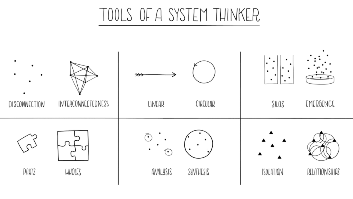 1. السبب والنتيجة: إن أساس التفكير المنظومي أن يكون الفرد واعيا بأنه يفكر في نماذج واضحة، وتكون لديه القدرة على بنائها وتحليلها، وبناء النماذج يرتبط ارتباطا وثيقا بالعلاقات البسيطة للسبب والنتيجة!