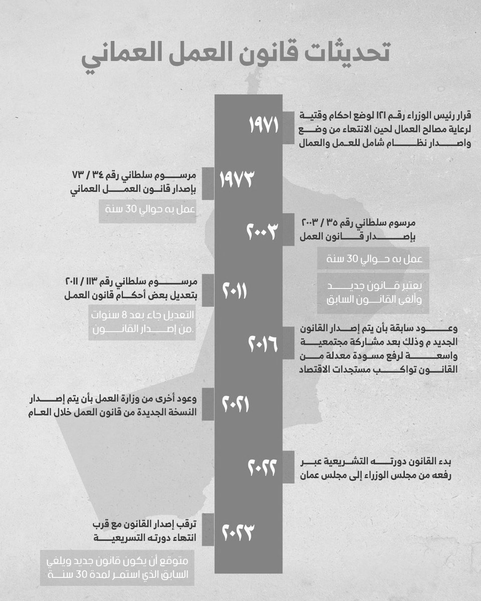 لو لاحظتم.. قانون العمل المعمول به في سلطنة عمان استمر لمدة 30 سنة تقريبًا، وبعدها يتم تغييره وليس تعديله فقط لكثرة التعديلات التي تتطلبها الأوضاع والظروف الاقتصادية.