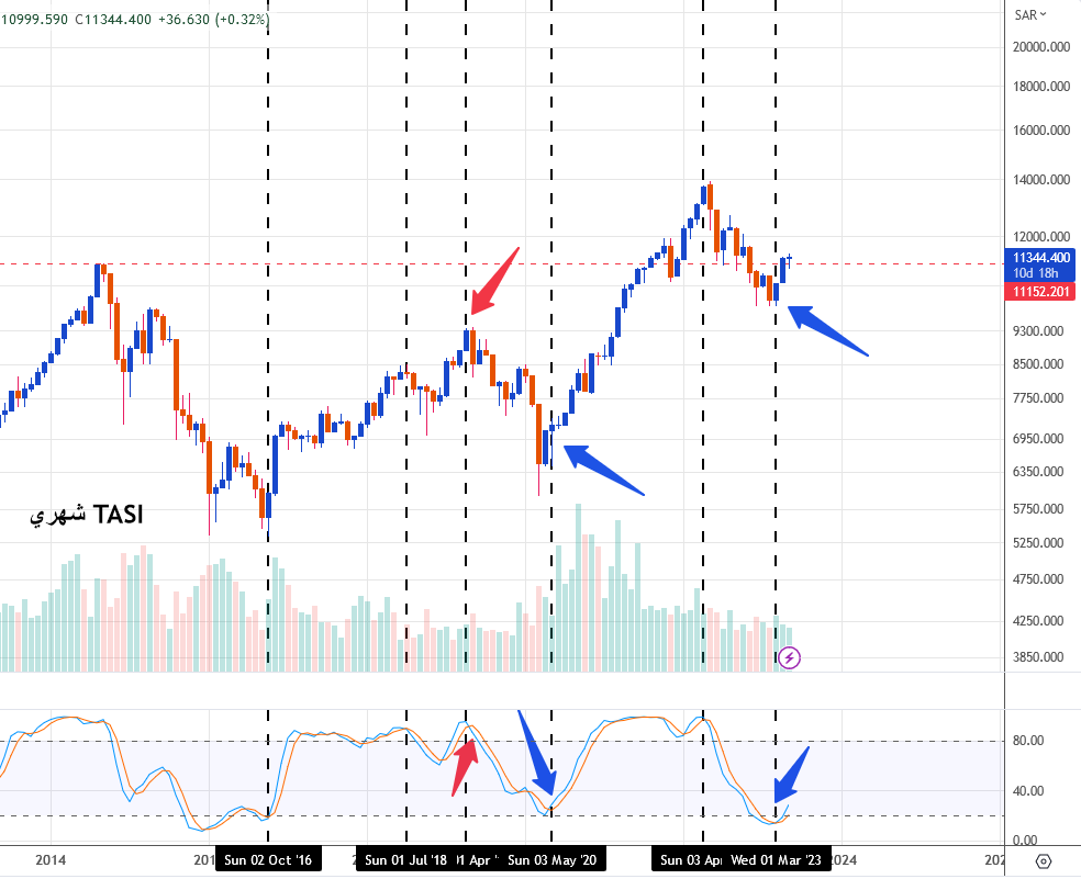 ويظهر في الشارت الشهري لـ #تاسي اشارات الدخول (بالازرق) والخروج (بالأحمر ) كما أعطاها المؤشر.