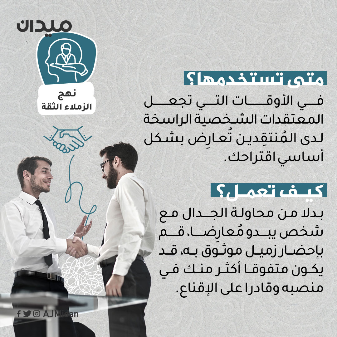 لا تخلو بيئة العمل من الخلافات والمعارضات لوجهات النظر لكن هناك من يستطيع أن يتجنب تلك الخلافات عن طريق اتباع إستراتيجيات تحول المعارض إلى محالف..