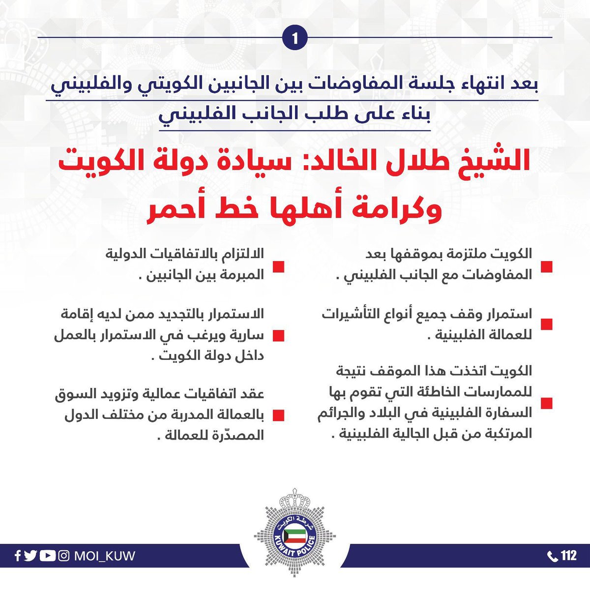 وبناءا على ما تقدم تتمسك وزارة الداخلية بموقفها الرافض لاي انتهاكات لسيادة الدولة وكرامة مواطنيها، والاستمرار بقرارها بوقف جميع أنواع التأشيرات للجالية الفلبينية حتى إشعارٍ آخر، مع الاستمرار بتجديد إقامات من لديه إقامة سارية ويرغب في الاستمرار بالعمل في دولة الكويت وفق القوانين واللوائح المنظمة.