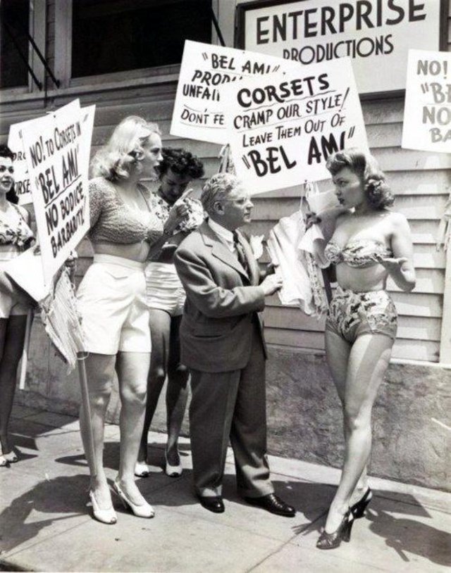 - Las actrices protestan por el uso de corsés en las actuaciones. Broadway, Nueva York, Estados Unidos, 1946.