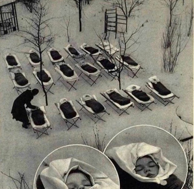 - Los bebés duermen afuera para mantener su sistema inmunológico fuerte, 1958 Unión Soviética.