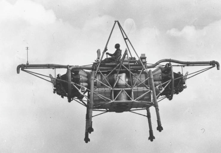 - Un piloto conduce una máquina experimental Rolls Royce conocida como “Flying Bedstead”.