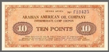10) واجهت الشركة مشكلة عدم رغبة أكثر موظفيها الأجانب حمل النقود المعدنية الثقيلة، بإصدار إيصالات ورقية (لها نقاط وكل نقطة = ريال)، للشراء داخل مرافقها، لكن استعملها الموظفون الأجانب أيضا في الأسواق المحلية (مثل الخبر) حيث كان تجارها يستبدلون الإيصالات بريالات من مكتب صرف #أرامكو