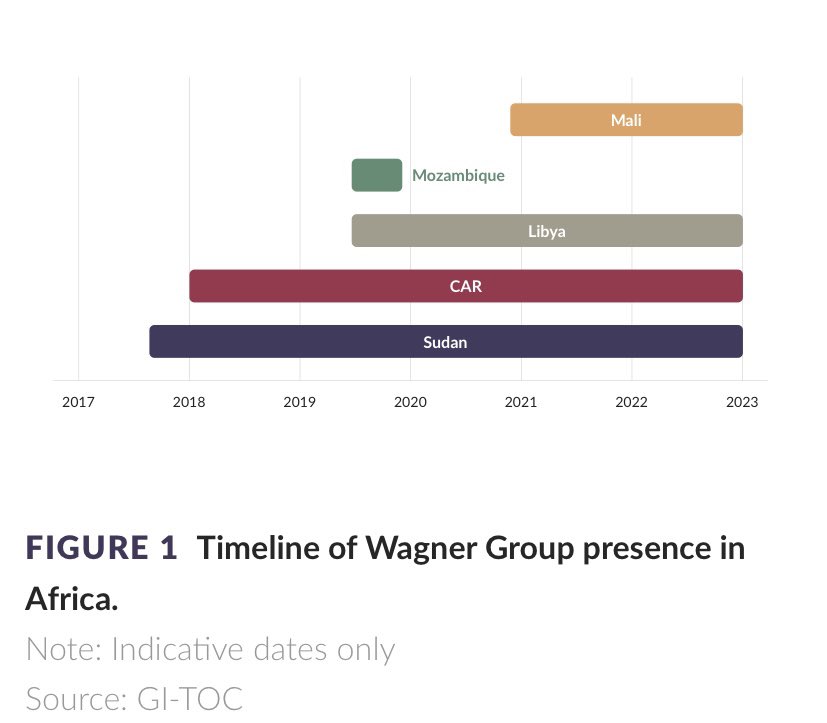 ٧. في أواخر عام 2017 نشرت #فاغنر حوالي 500 جندي في #السودان. في عام 2022 تم نشر قوات فاغنر في #جمهورية_إفريقيا_الوسطى و #مالي و #ليبيا والسودان. يذكر أن ڤاغنر تجنّد من السجون الروسية منذ منتصف عام 2022.