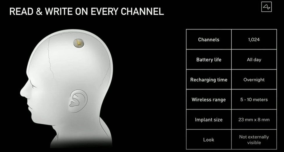 ودلوقتي الشركه خدت الموافقة للتجارب علي البشر خلال الفترة اللي جايه واللي هتتزرع له الشريحه هيعمل عمليه بسيطه فقط عشان تتحط في غلاف القشرة الدماغيه بحجم عمله معدنية صغيرة وتتواصل مع المناطق في المخ وتقدر وقتها تعالج كم مشاكل طبيه مهما كان عددها