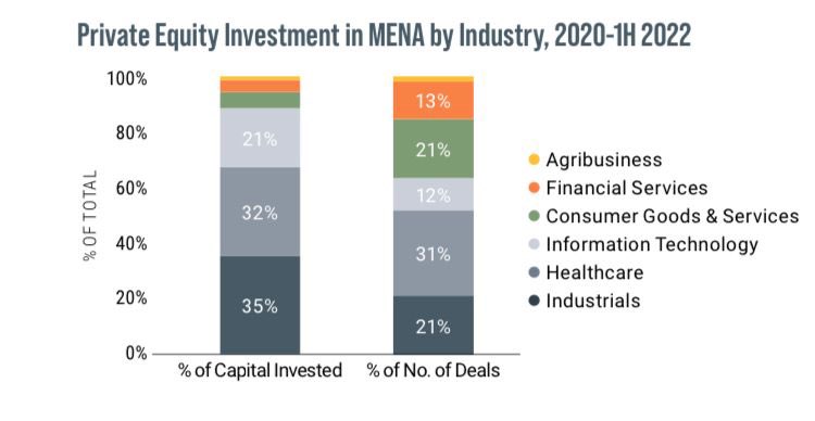 كما أظهر التقرير أن مستثمري الملكية الخاصة PE اغلقوا العدد الاكبر من الصفقات بين عامي 2020 الى 2022 في قطاع الرعاية الصحية كما يظهر الشارت أدناه عدد الصفقات وحجم رأس المال المستثمر بحسب الصناعات.
