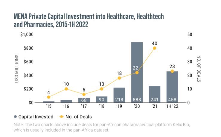 كما يسلط التقرير التالي الضوء على نمو عدد الصفقات ورأس المال المستثمر في قطاع الرعاية الصحية بشكل خاص بين عامي 2015 الى 2022 .
