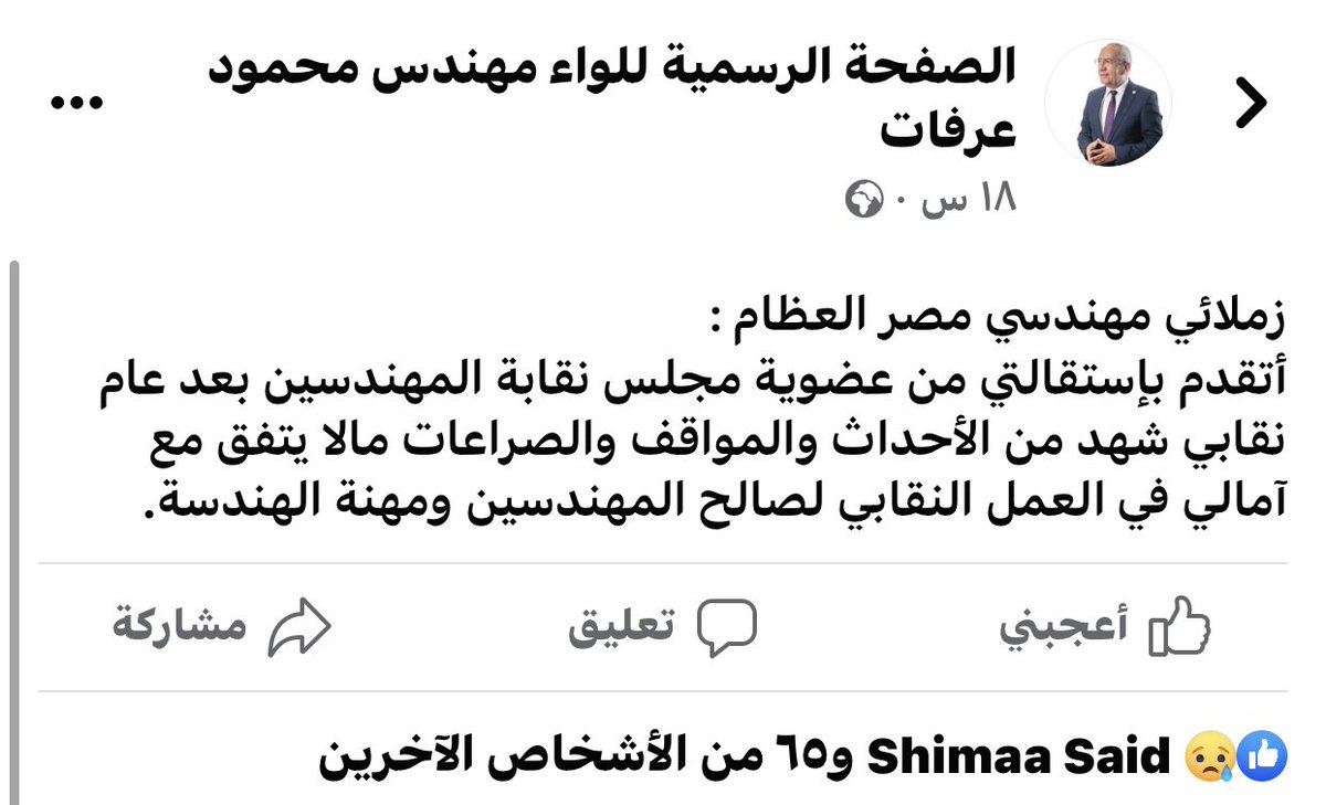 *استقالة اللواء محمود عرفات نائب وزير الانتاج الحربي من المجلس الأعلى لنقابه المهندسين*