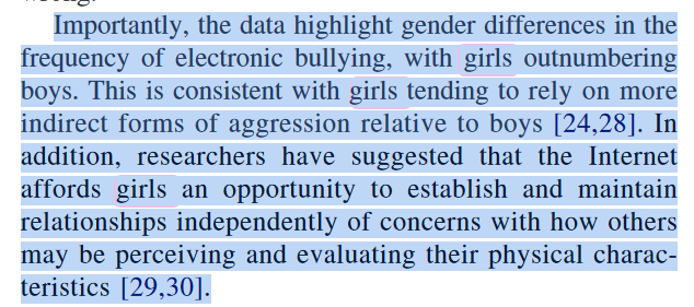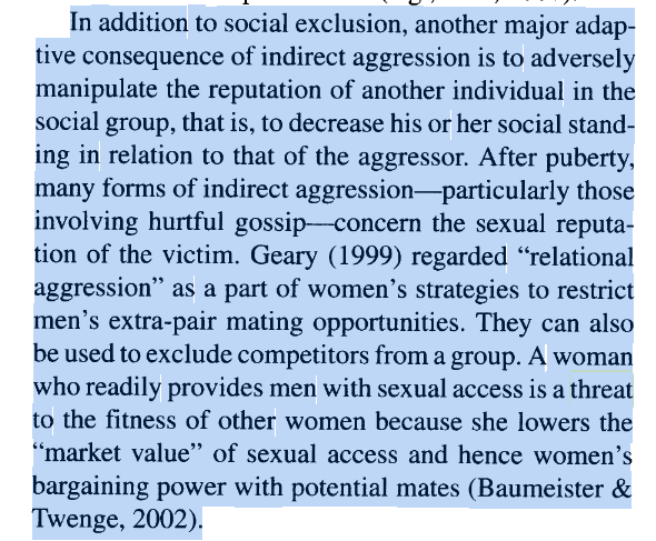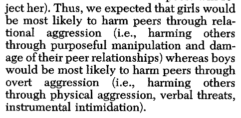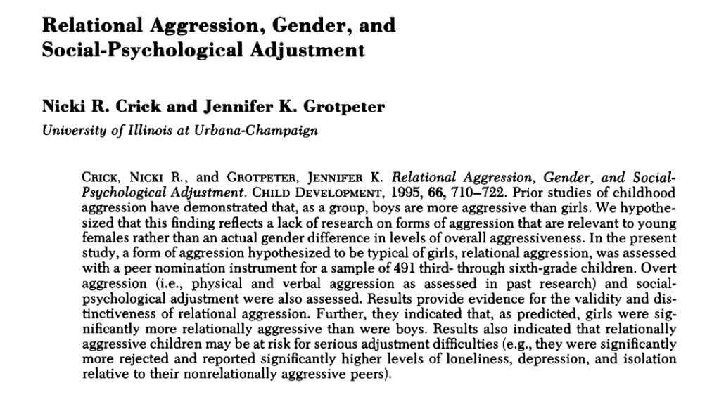 نتيجة مهمة أخرى هي أن النساء أكثر عرضة من الرجال للانخراط في العدوان العلائقي الذي يتضمن تدمير العلاقات الاجتماعية مع الآخرين من خلال الاستبعاد أو التلاعب.