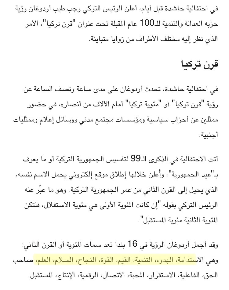 أعلن الرئيس أوردوغان عن رؤيته خلال سنوات رئاسته المقبلة والتي سيسعى فيها لتحضير تركيا نحو الانتقال بسلاسة إلى القرن المقبل، وهي رؤية اتسمت بأنها تركز على حل أزمات الداخل ودعم الهدوء والاستقرار في علاقات الخارج، في موقف مغاير تمامًا لمشروع الدولة العثمانية التوسعية السابق.