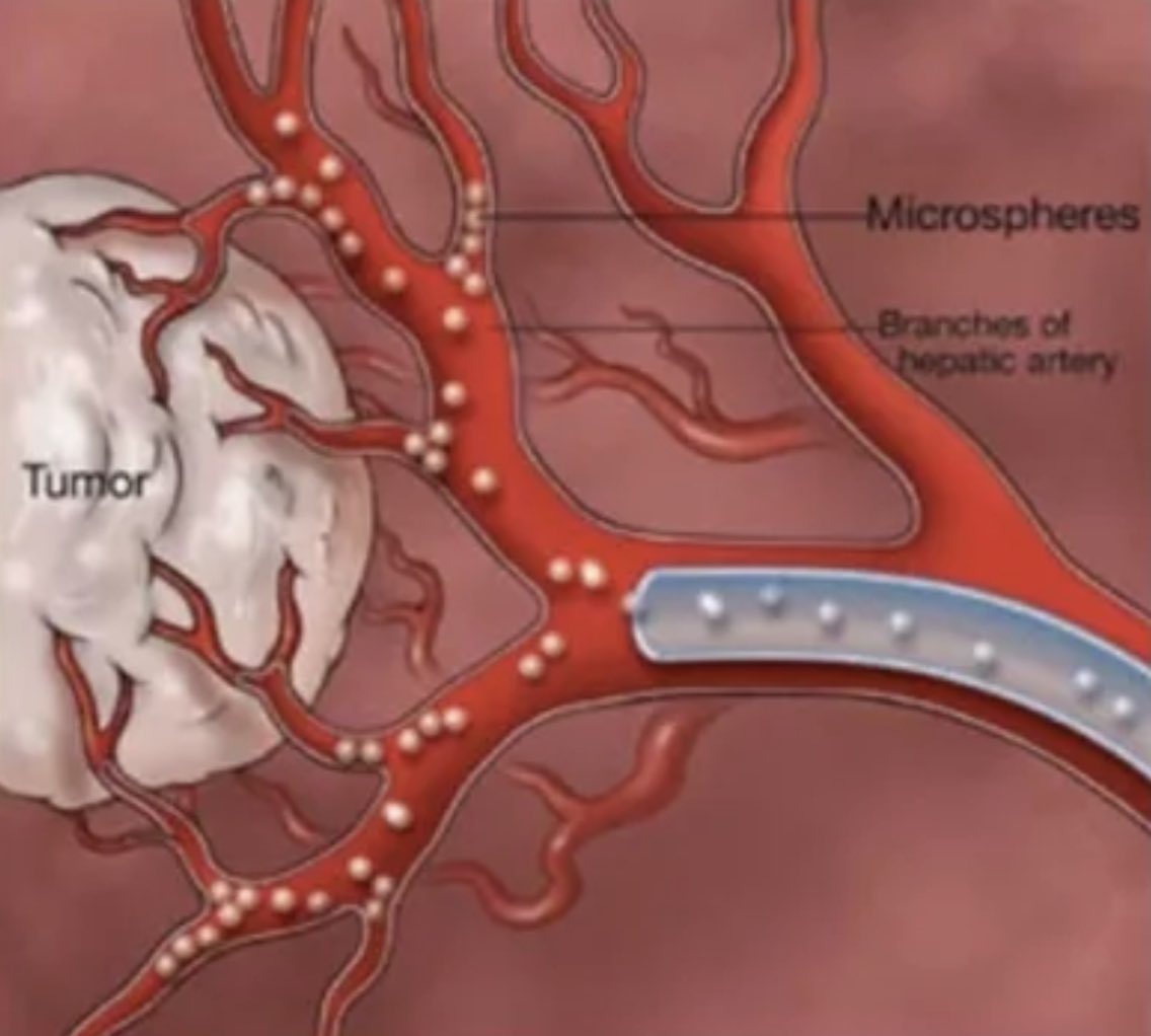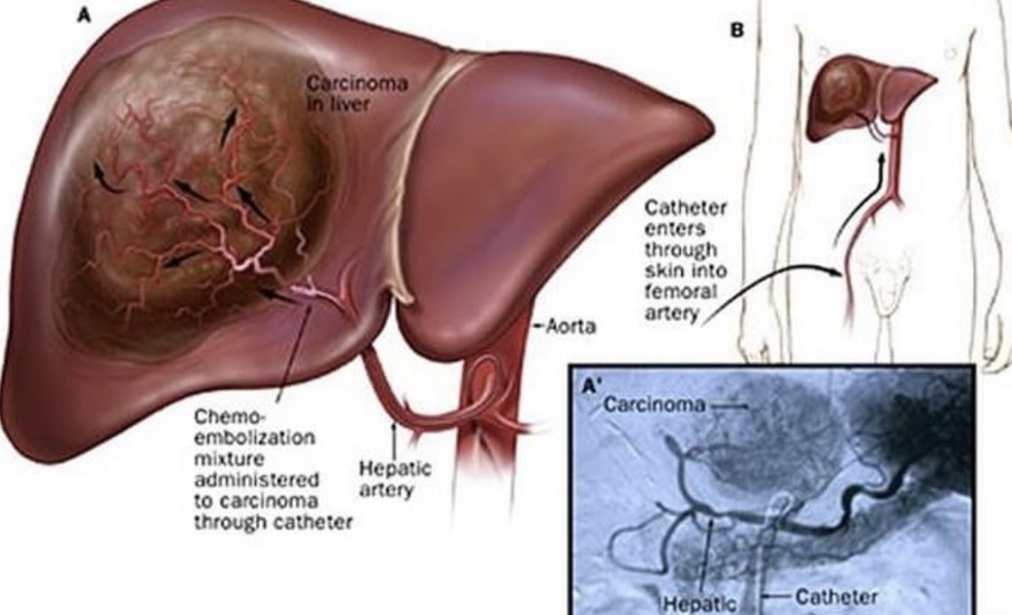 ⬅️ حيث يمكنُ توصيل أدوية (العلاج الكيميائي أو كرات زجاجية صغيرة تحتوي على إشعاعات)مباشرةً إلى الخلايا السرطانية، باستخدامِ قسطرةٍ تمُرُّ عبر الأوعيةِ الدمويةِ لتصل للكبد مباشرة.