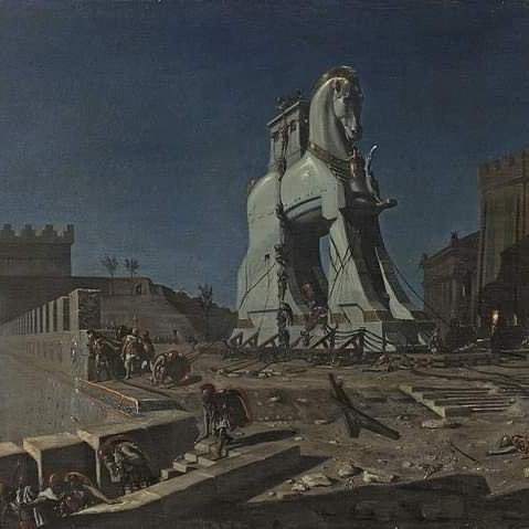 إقتنع أهـل طروادة بهذا الأمر بسبـب جاسوس ينتمي إلى الجيش الإغريقي استطاع إدخال هذه الفكرة في رأسهم،
