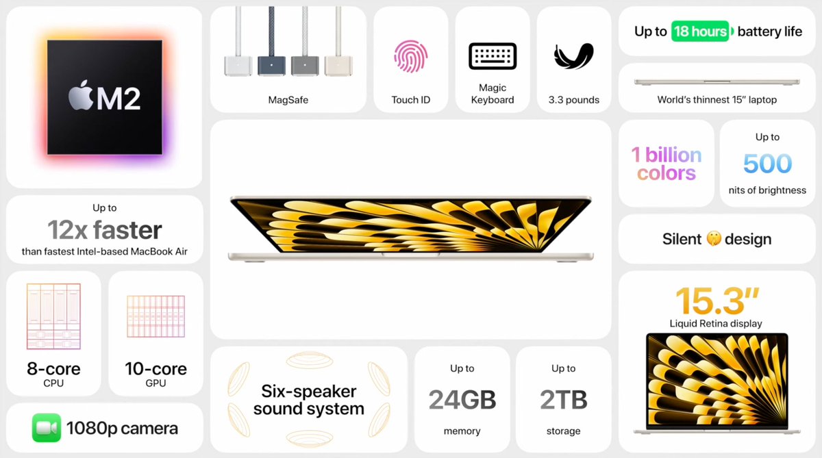 MacBook Air laptop, now in 13-inch and 15-inch models. With the blazing-fast M2 chip, all-day batter...
