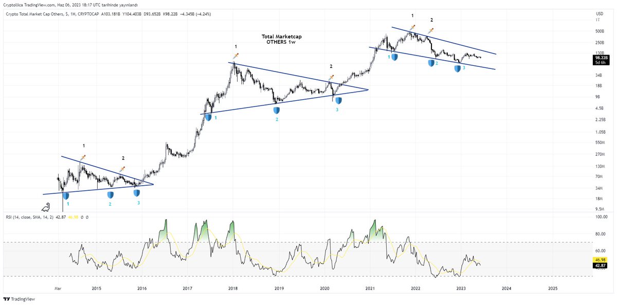 Total3 (BTC ve ETH hariç tüm piyasa) Zaten bunlar yükseliyorsa, piyasa yükseliyor demektir. Kritik noktalar grafikler üzerinde işlenmiştir. #altcoin