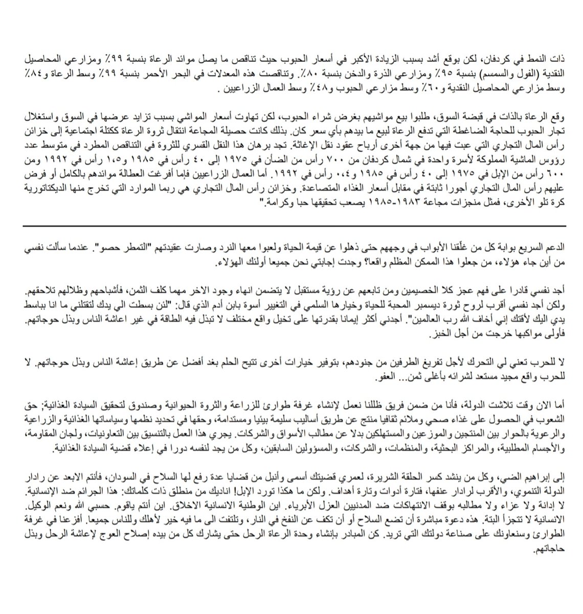 […]المجاعة دالة للعلاقة بين الغذاء والناس، وهي في جانب عظيم منها ميل في التوزيع يعكس القدرات الشرائية المتفاوتة للفئات الاجتماعية المختلفة في صراعها على الموارد المتاحة، أي أنها من حاصل السوق، وما العنف الذي نشب في كوستي وفي طرق النقل سوى احتجاج على هذا العوج.