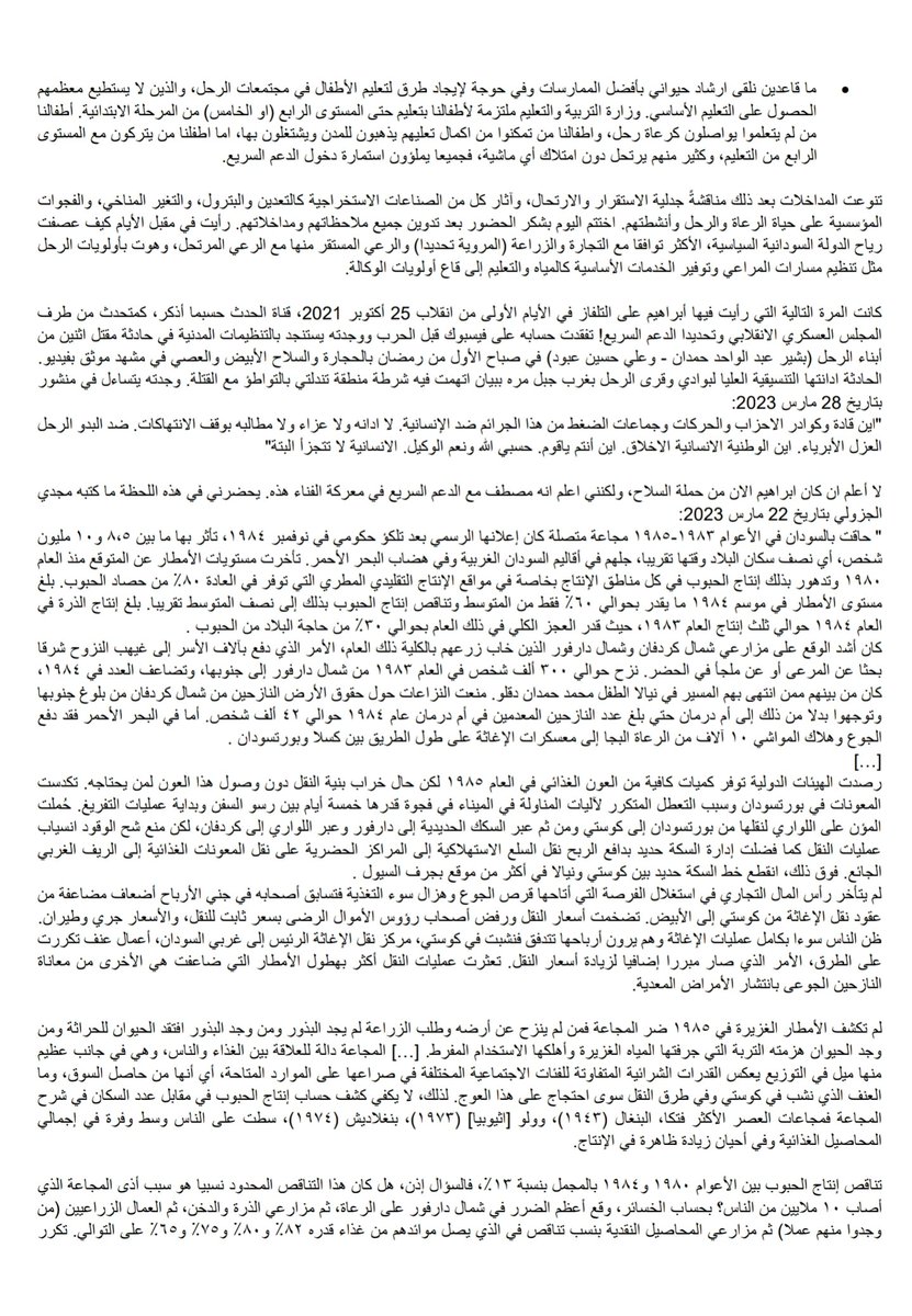 هذه دعوة مباشرة أن تضع السلاح أو أن تكف عن النفخ في النار، وتلتفت الى ما فيه خير لأهلك وللناس جميعا. أفزعنا في غرفة الطوارئ وسنعاونك على صناعة دولتك التي تريد. كن المبادر بإنشاء وحدة البدو الرحل حتى يشارك كل من بيده إصلاح العوج لإعاشتهم وبذل حاجاتهم.