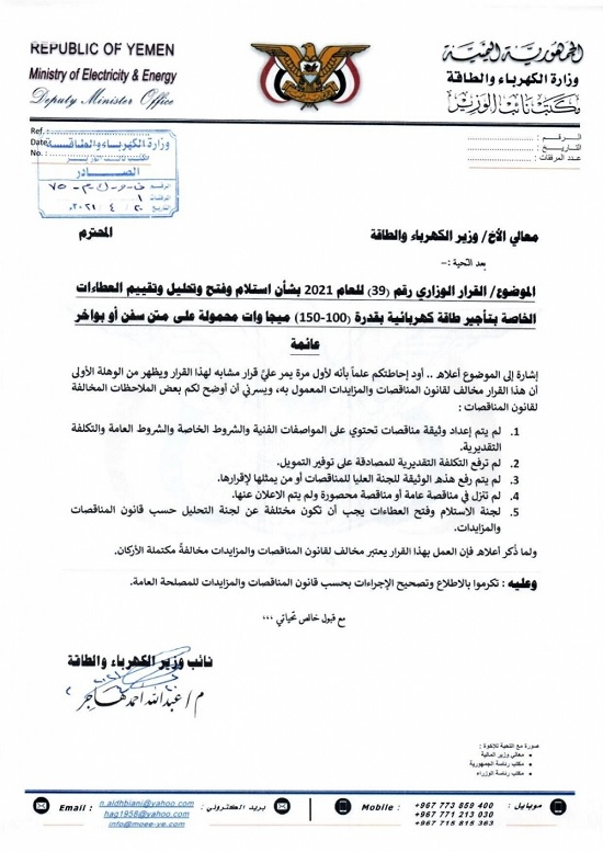 وقع المحافظ في 2022 اتفاق باستئجار باخرة كهرباء لتوليد 100 ميجا وات ولمدة 5 سنوات وبمبلغ 122 مليون دولار