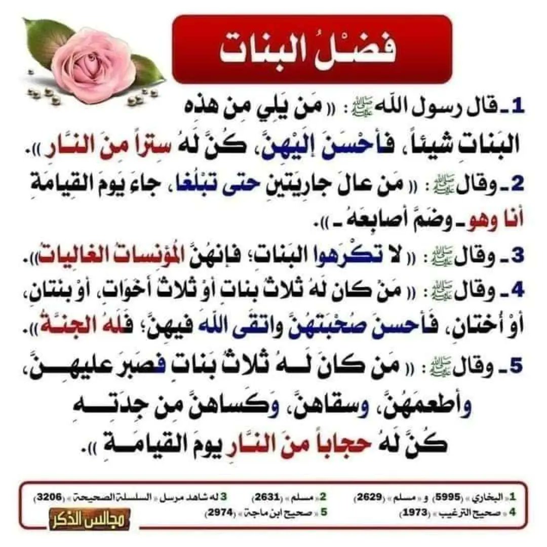 كان رجل يُرزق بالبنات، فكانت عنده ست من البنات، وكانت زوجته حاملآ، فكان يخشى أن تلد بنتا، وهو يرغب بالولد؛ فعزم في نفسه على طلاقها إن هي جاءت ببنت، ونام تلك الليلة، فرأى في نومه كأن القيامة قد قامت، وحضرت النار، فكان كلما أخذوا به إلى أحد أبواب النار وجد إحدى بناته تدافع عنه⬇️