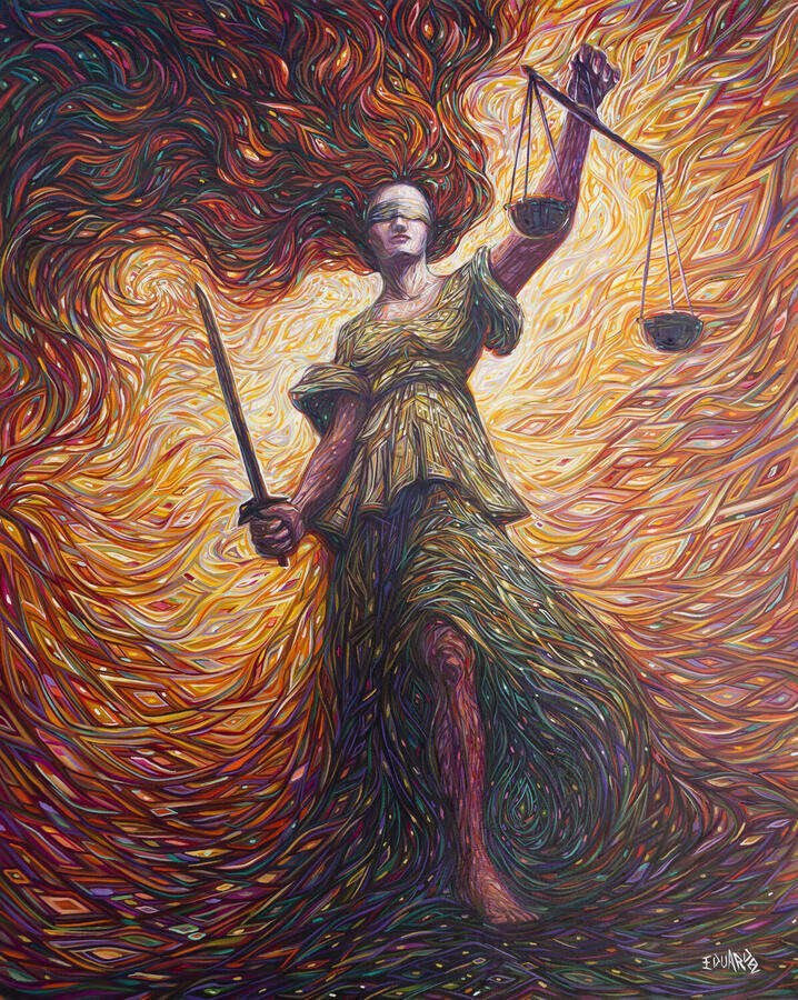 لم تكن لدلالاتها عشوائية. فالمعصوبة العينين لتدلُ على حيادتها،دون أيّ تمييز فلا فرقَ بيّن الغني والفقير أو رجل وامرأة، والميزان لتشير بإحقاق الحق، والسيف دلالة إلى ردع الجاني واقتصاص الحق منه.وعن كونها امرأة قيل لأنها رغم اقتصاص الحق إلى أن الرحمة موجودةولكن لا أساس لها من الصحة