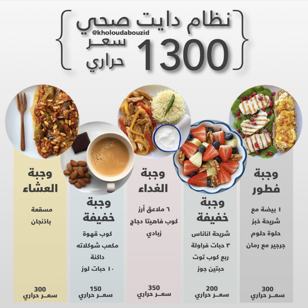 إليك نظام غذائي صحي يومي منخفض السعرات الحرارية، 1300 سعرة حرارية يوميا لمدة أسبوع.