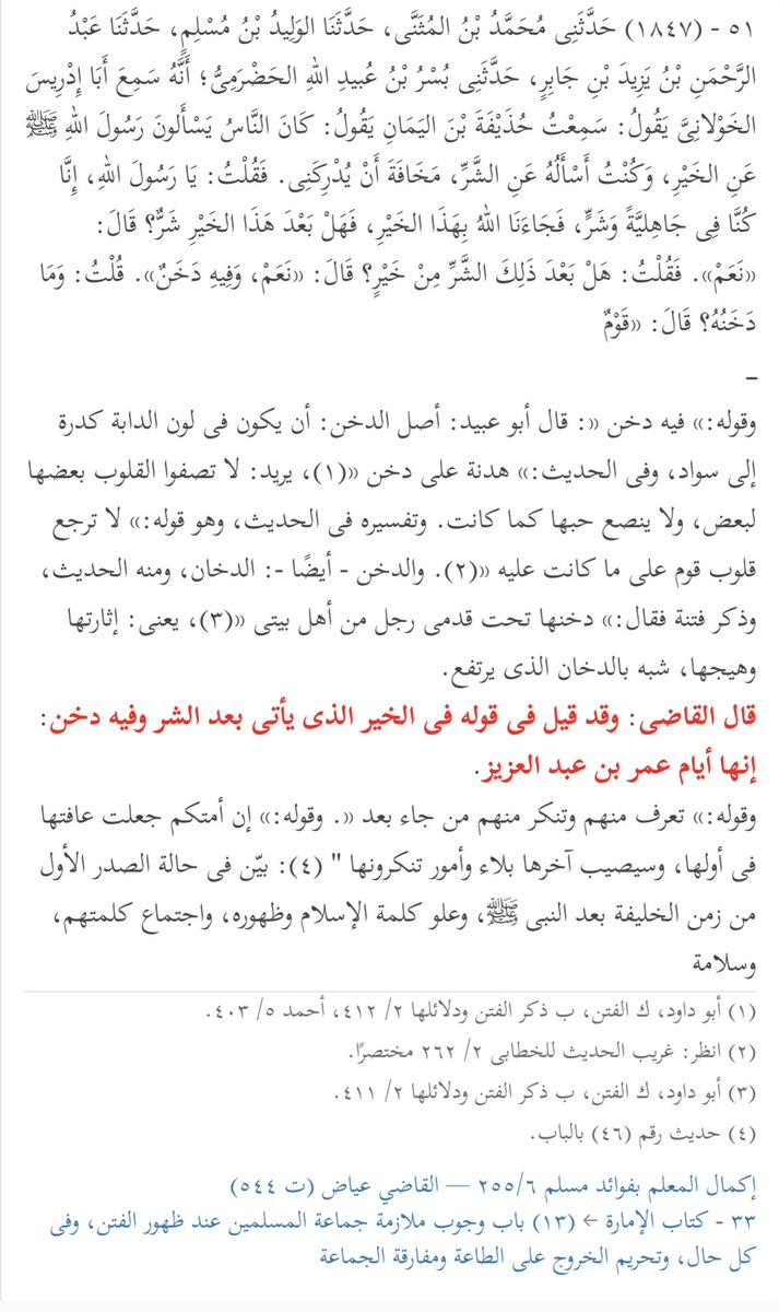 ٢. الخير الذي فيه هدنة على دخن: الخير فتوح القوم، والهدنة هدنة الأمير معهم،ودخن هذا الخير بدعم المخالفة لسنة النبي ﷺ.