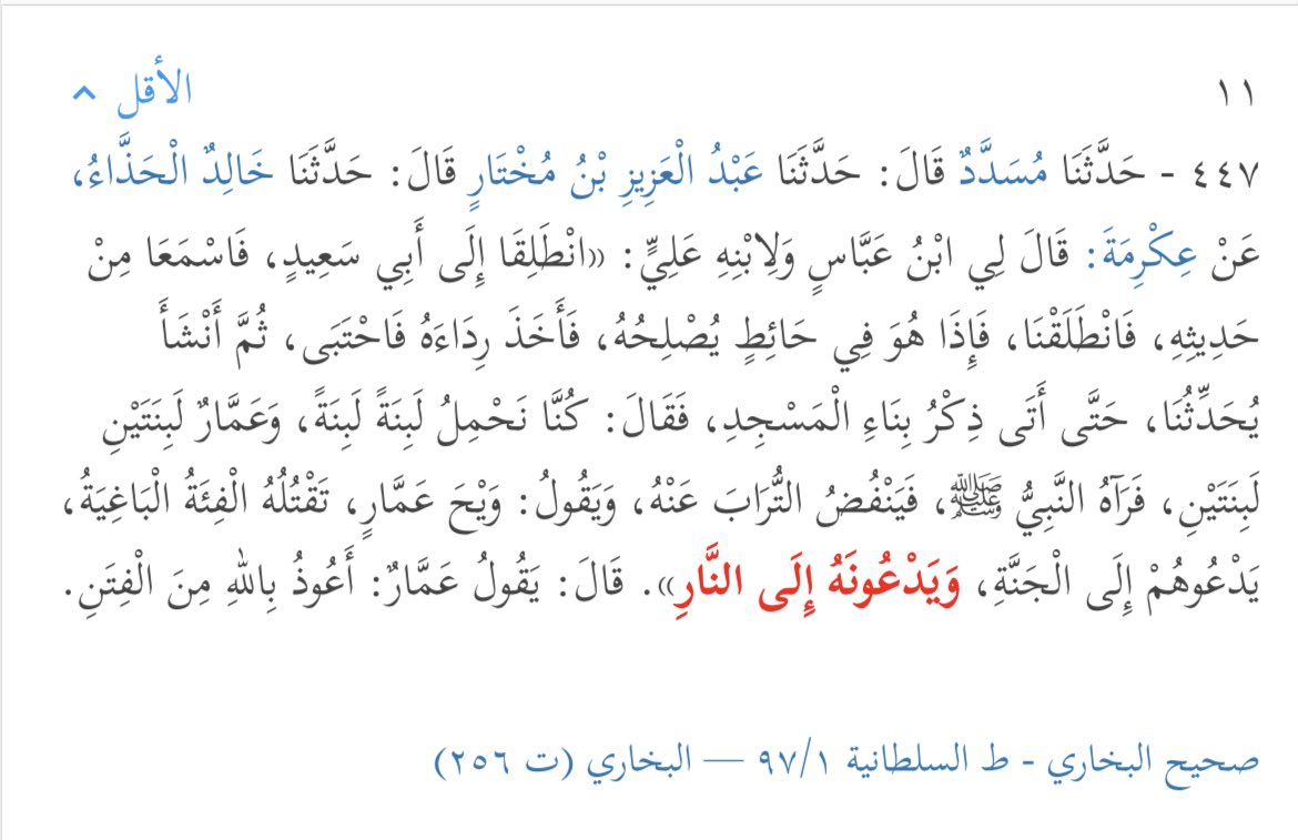 ودعوة عمار إلى الجنة هي الدعوة إلى طاعة إمام الحق ولزوم جماعته المحقة، وهو أمير المؤمنين علي بن أبي طالب ﷺ، كما رجحه «ابن هبيرة» لكنه خلط المراحل ليجعل أول الشرور ما حدث في زمن عثمان.