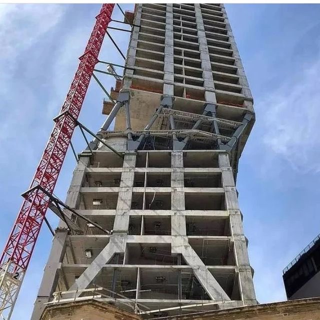 على الرغم من أن الهيكل خرساني بشكل أساسي ، فقد تم تطوير بعض العناصر الرئيسية لتشمل أقسام وإطارات فولاذية إنشائية عند الاقتضاء. يتم توفير العنصر الفولاذي الأكثر بروزًا في شكل هيكل ثلاثي الأبعاد عميق مكون من ثلاثة طوابق عند الالتواء. تم تطوير تصميم هذه الأعمال الفولاذية بعناية للتنسيق مع الهيكل الخرساني الأساسي والاستفادة من البناء الأساسي السابق لتقليل الأعمال المؤقتة. هذا مهم بشكل خاص مع الأخذ في الاعتبار تعديل 6-7 م على مخطط بعض الأعمدة وحواف الأرضية ، كل 50-60 م فوق مستوى الأرض أدناه.#FANWBINA #فن_وبناء