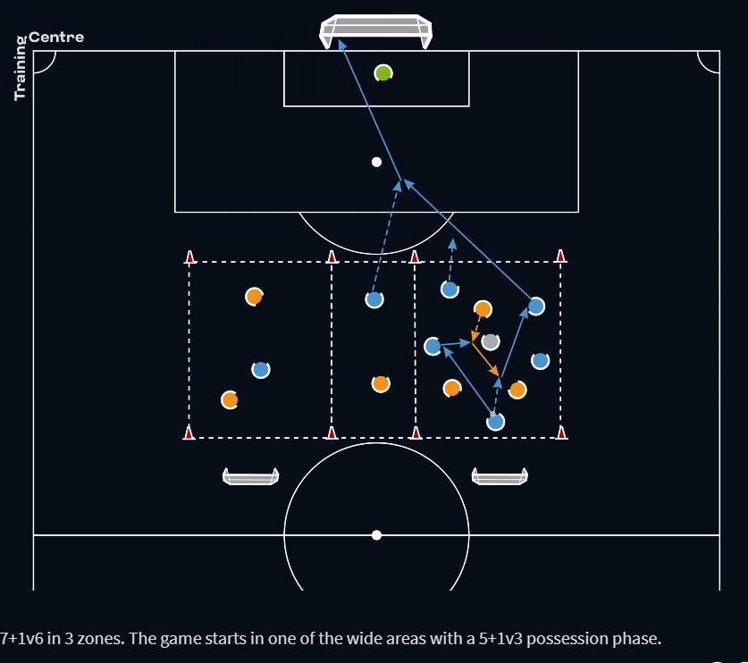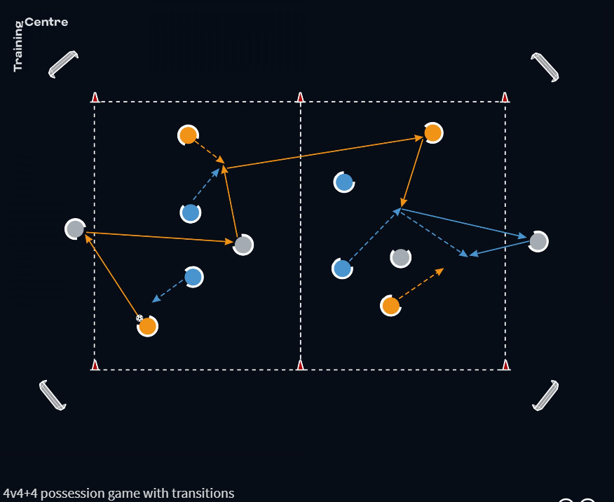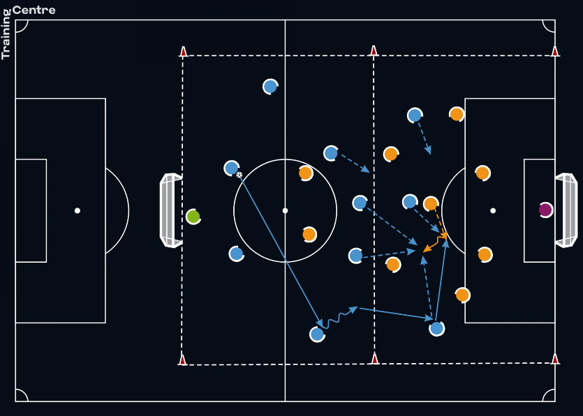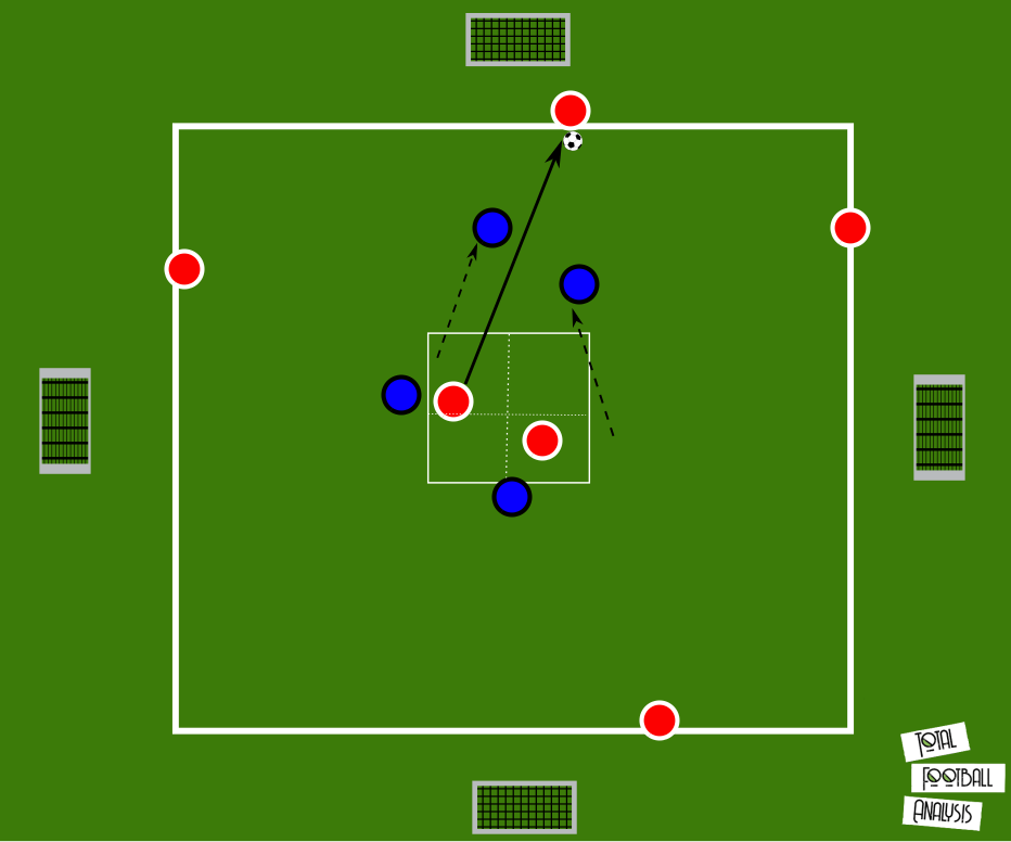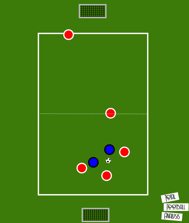📌بعد رد الفعل السريع على فقدان الكرة يحتاج باقي اللاعبين الذين لم يشاركوا بشكل مباشر في الضغط لضمان عدم وجود طريقة سهلة للخروج من ضغط الخصم فيحتاجون إما لتحديد اللاعبين المتاحين/تحديد مسار التمرير المتاح