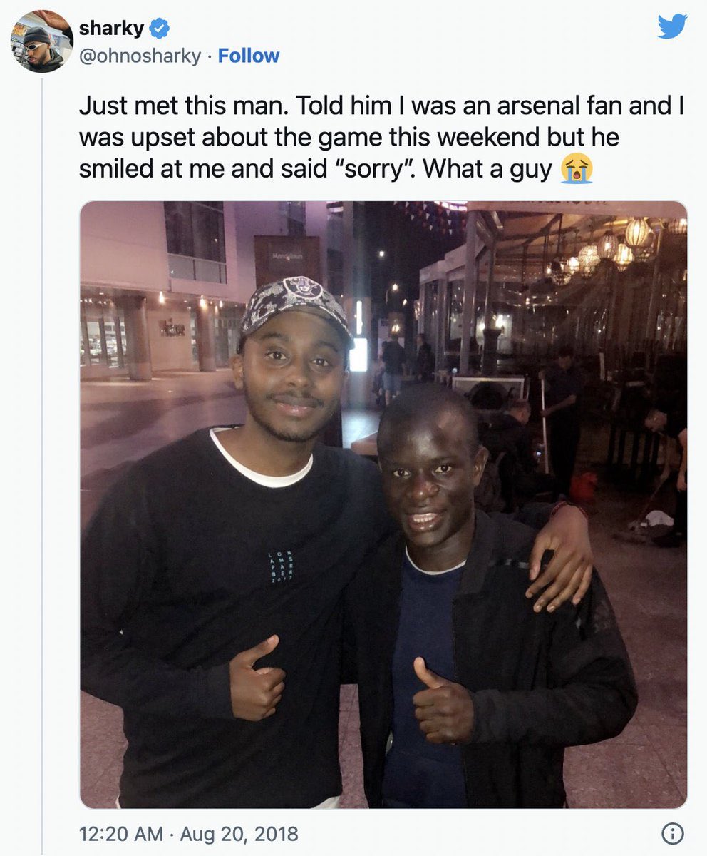 عندما عبر مشجع ارسنال عن خيبة أمله بنتيجة المباراة ، اعتذر كانتي له عن النتيجة 🥺❤️