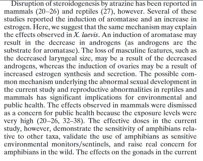 ويشير إلى أن تعطيل تكوين الستيرويد الناجم عن الأترازين قد يكون له آثار أوسع تتجاوز النمو الجنسي، مما قد يؤثر على العمليات الفسيولوجية الأخرى.