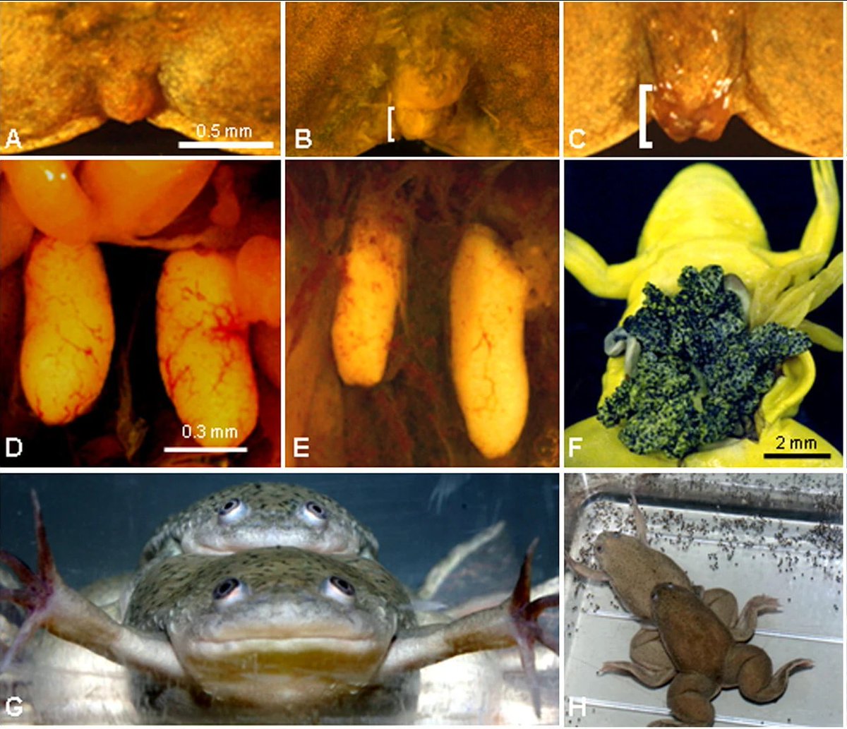عانى الذكور من اكتئاب هرمون التستوستيرون، وانخفاض حجم الغدة التناسلية، وتغير الصوت، قمع سلوك التزاوج، وانخفاض تكوين الحيوانات المنوية ، وانخفاض الخصوبة. تتوافق هذه البيانات مع تأثيرات الأترازين التي لوحظت في فئات الفقاريات الأخرى.