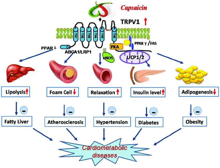 عندنا ايضا المركب الكيميائي "capsaicin" موجود في الفلفل الحار بمجرد ما تبدأ في أكله ، يبدأ ينشط مستقبل TRP_V1 ونشعر بالحرارة العالية من أي شي حار كالفلفل مثلا