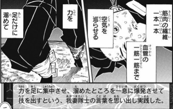 اخبره زينتسو ان تنفس البرق بالكامل يقتصر على تركيز على القدمين في الغالب.لذلك مستخدم تنفس البرق يحب ان يدرك حجم جسده او شكل كل واحد من عضلات جسمه .
