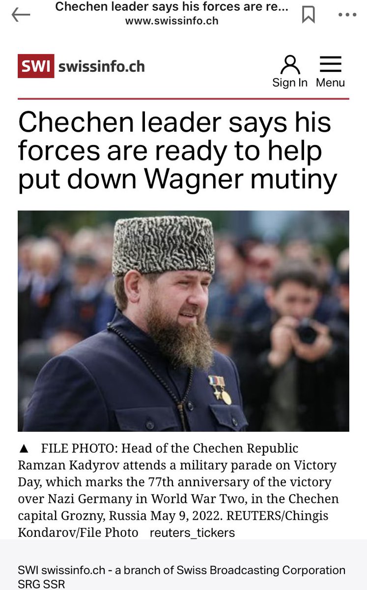 رمضان قديروف الزعيم الشيشاني اعلن يوم امس مساندته للرئيس بوتين ضد انقلاب فاغنر وان قوته على استعداد للدفاع عن روسيا وانها مستعدة (ان تتعامل بقسوة مع الخونة اذا تطلب الامر )