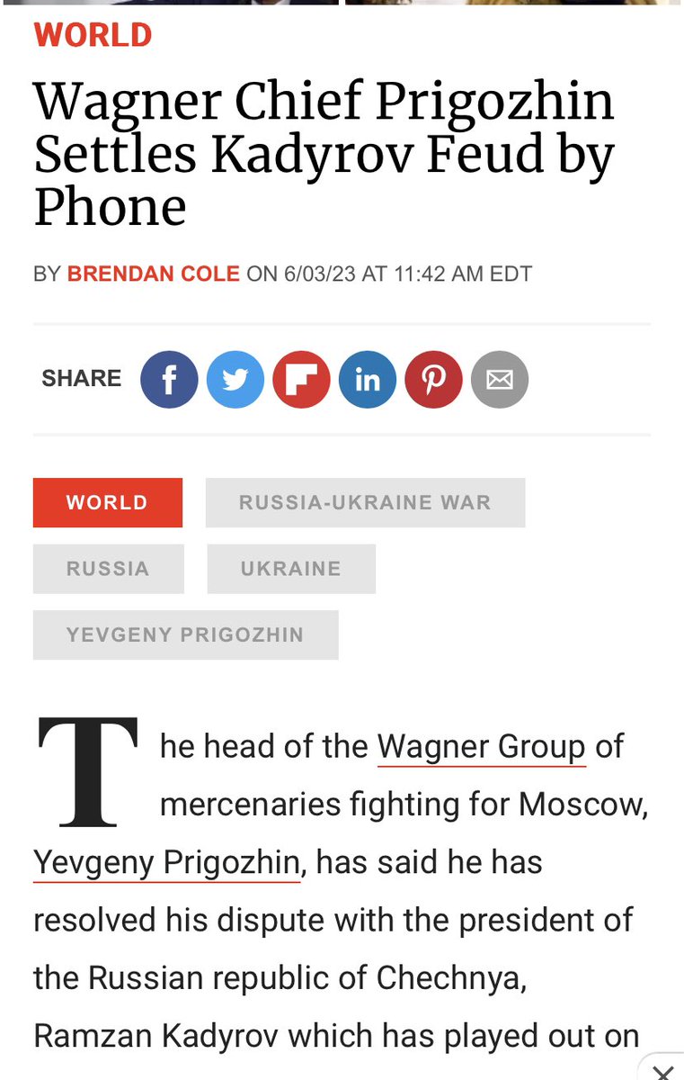 يوم امس وبعد انسحاب بريغو جين من الانقلاب على موسكو وافق زعيم فاغنر على ان يوقع جنوده عقود مع وزارة الدفاع الروسية كجزء من صفقة العفو عنه وعن جنوده او (صفقة الصلح مع موسكو).8️⃣