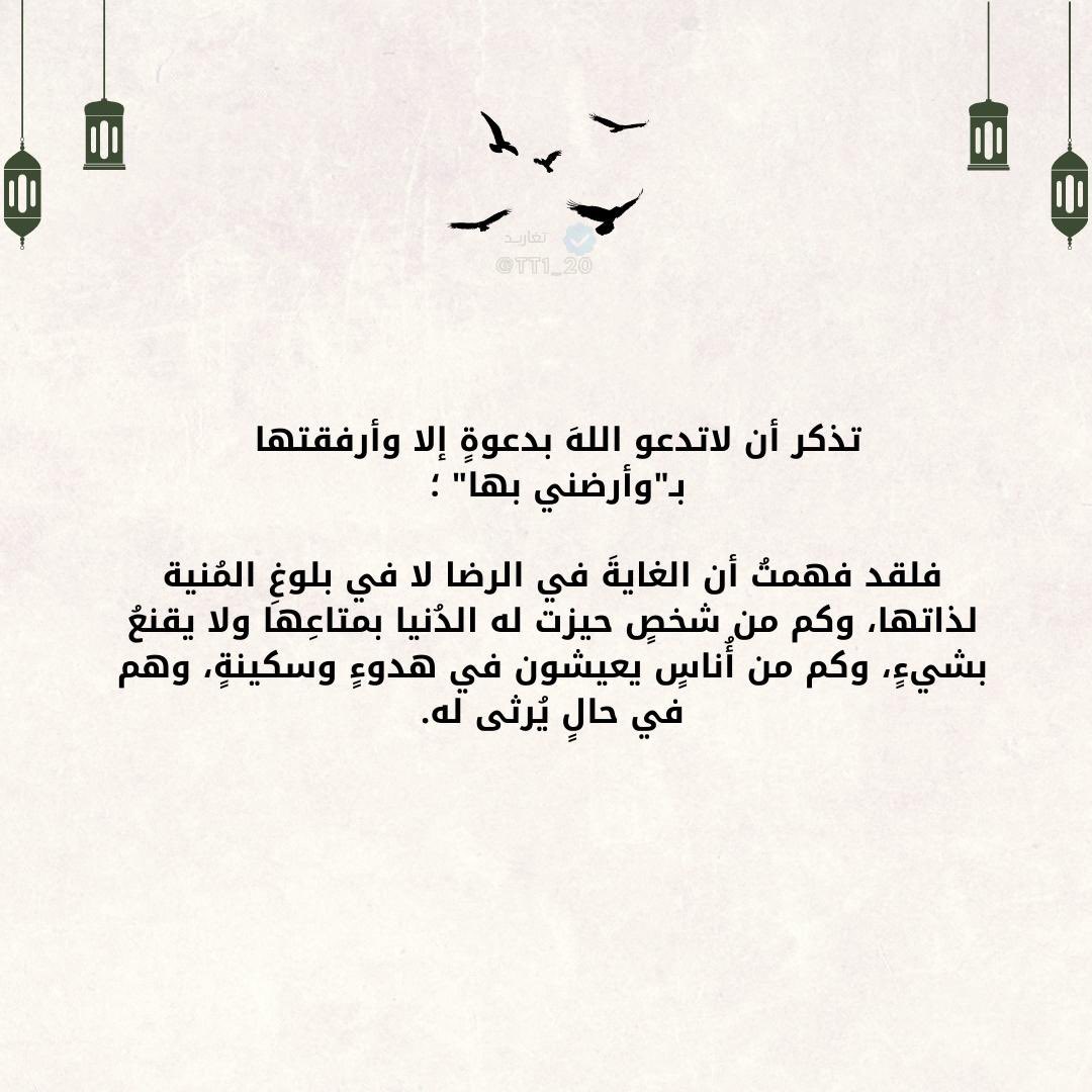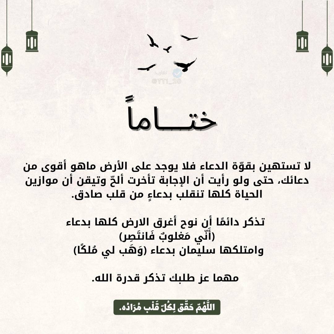 لا تستهين بالدُعاء، ولا تعتقد أن كفين رفعتهُما سترجعان لك خائبتين اطمئن الله يسمع صوتك يعلمُ مافي قلبك وان لم تنطقه ويقدر على إجابة دُعائك وكن على ثقـةٍ فيمن تلوذُ بِـهِ ، سَهمُ الدّعاءِ إذا أطلقتهُ يَصـل .