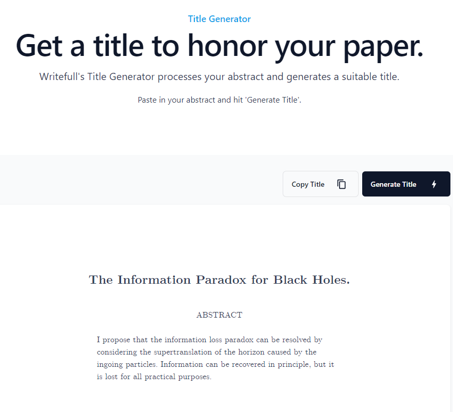هل تواجه صعوبة في إيجاد العنوان المثالي لورقتك؟ أدخل ملخصك العلمي، اضغط على 'Generate Title'، وشاهد كيف تنشئ الأداة لك عنوانًا مناسبًا.