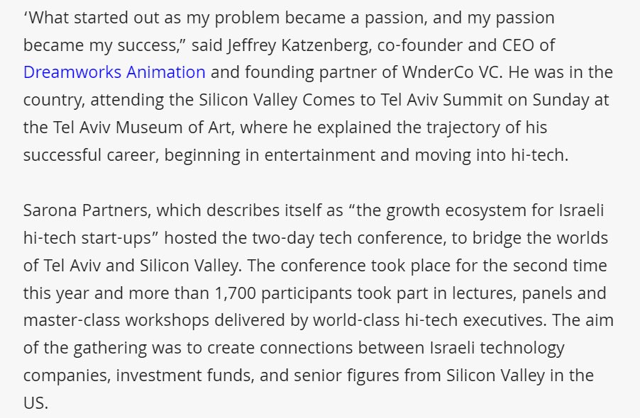 “Jeffrey Katzenberg was in the country, attending the Silicon Valley Comes to Tel Aviv Summit on Sunday at the Tel Aviv Museum of Art, where he explained the trajectory of his successful career, beginning in entertainment and moving into hi-tech.”