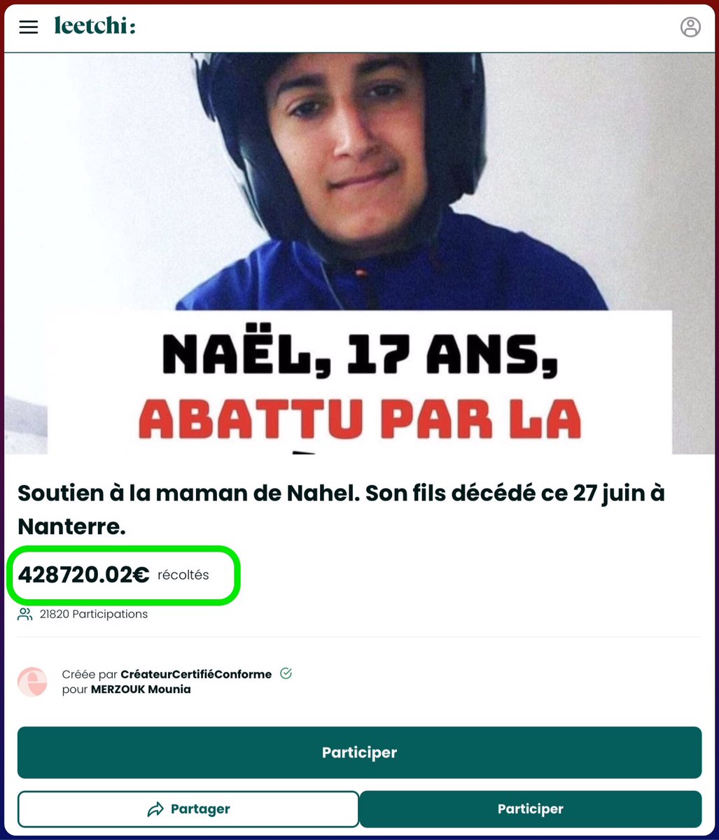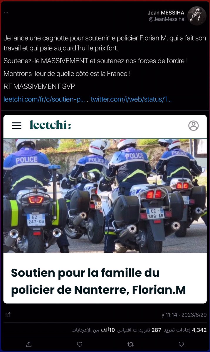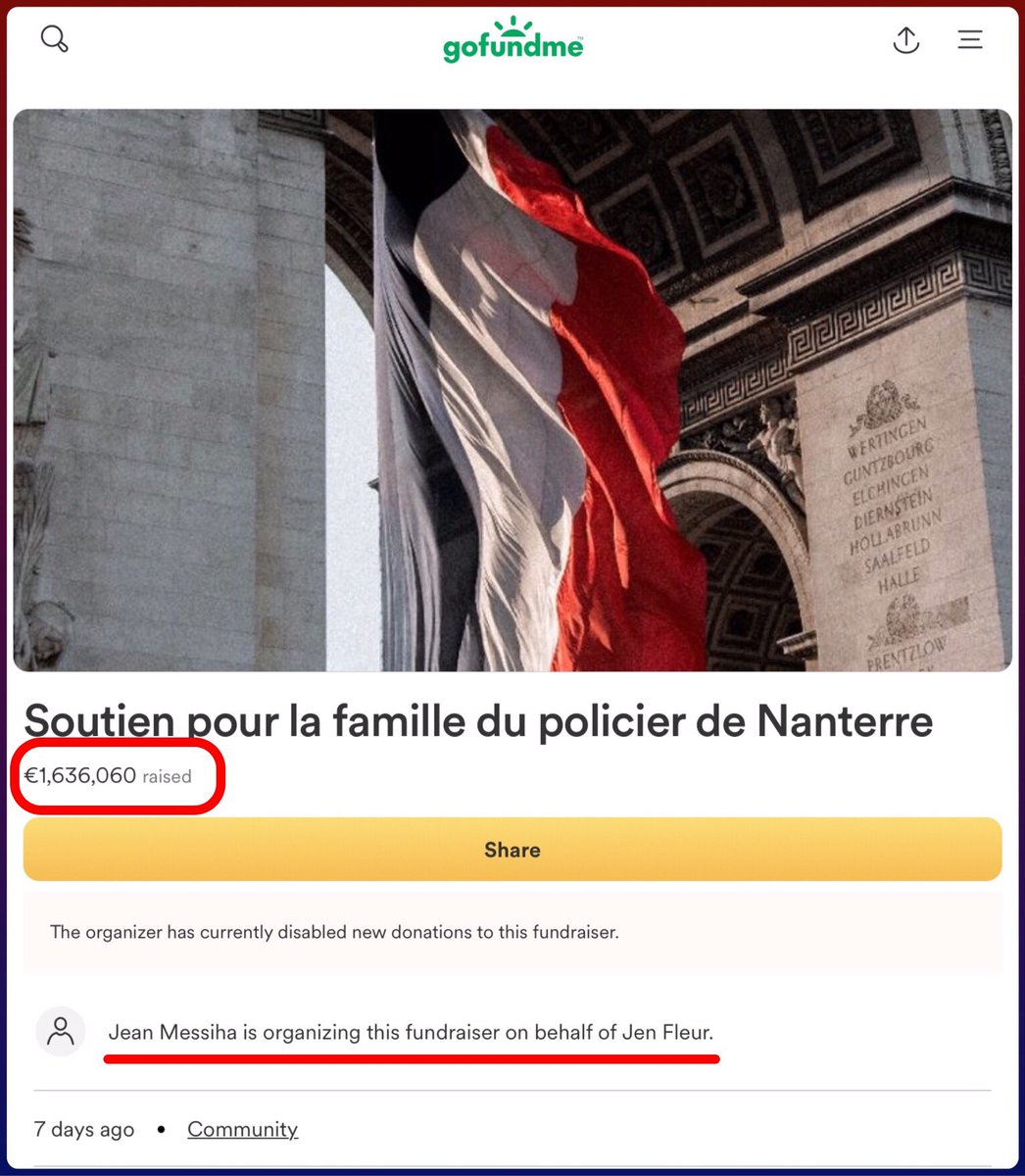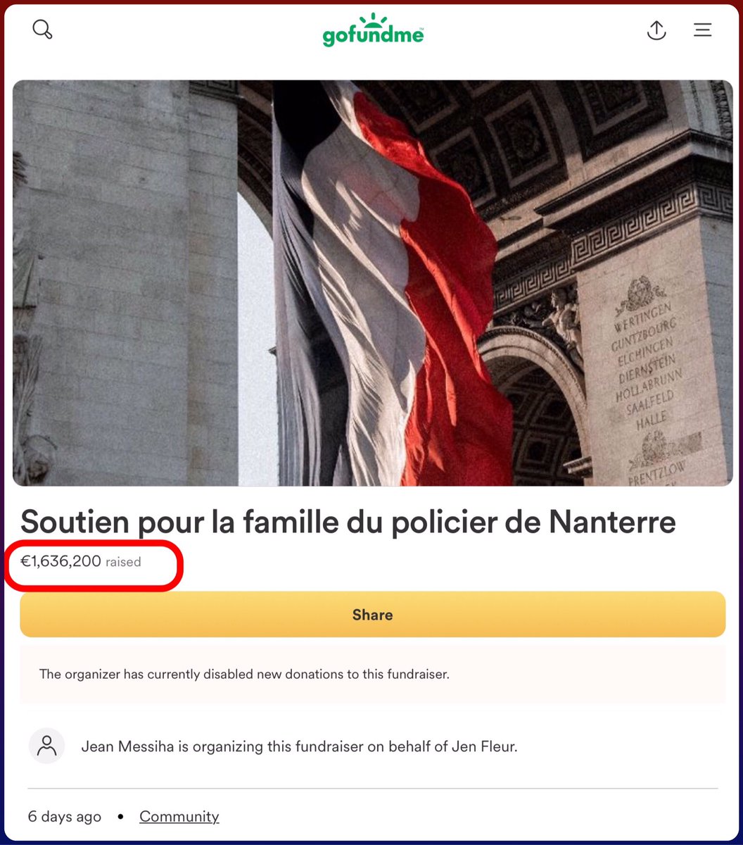 في إحدى أبشع الصور التي تفضح #فرنسا_العنصرية وبعد بدأ حملة جمع تبرعات لوالدة الشاب #Nael المقتول على شرطي، قامت شخصيات يمينية بحملة مضادة لدعم أسرة الشرطي..والنتيجة: