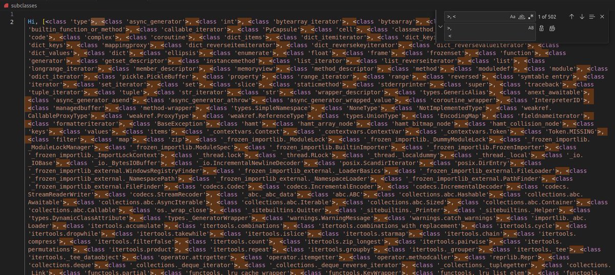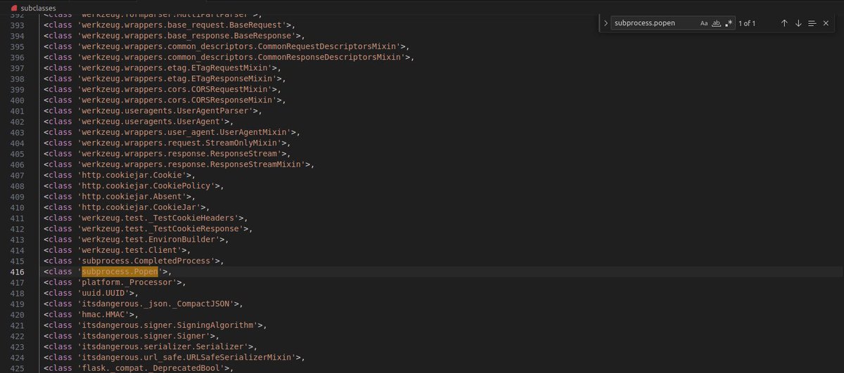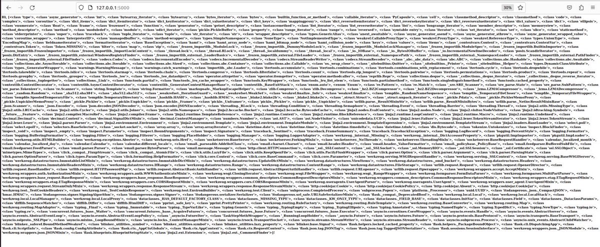 فبما اننا ما نقدر نستدعي مثلاً os.system() فنقشن عشان نجيب RCE من التمبلت، فف لذلك حنا نبي نصعد الى اعلى كلاس ونستعرض السب كلاسات او الفنقشنات الي نقدر نستخدمها
