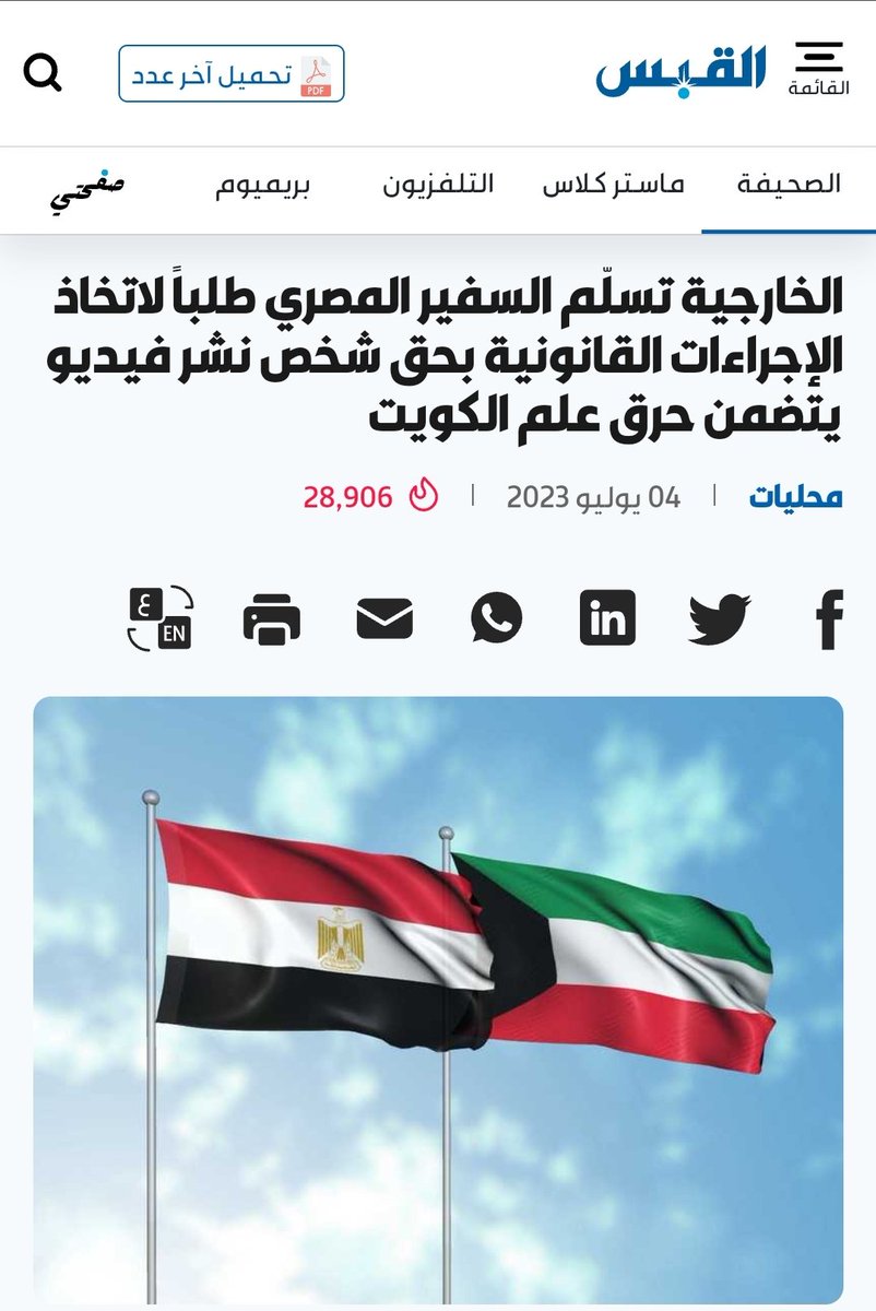طبعا الخبر تداولته صحف عربية وكويتية زي "القبس" اللي صدرته بعنوان:"وزارة الخارجية تسلم السفارة المصرية مذكرة تتضمن طلب دولة الكويت اتخاذ الإجراءات القانونية بحق المسيء لعلم البلاد".